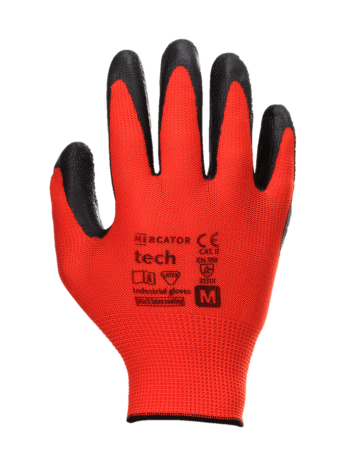 Luva universal vermelha de poliéster com revestimento de látex preto.